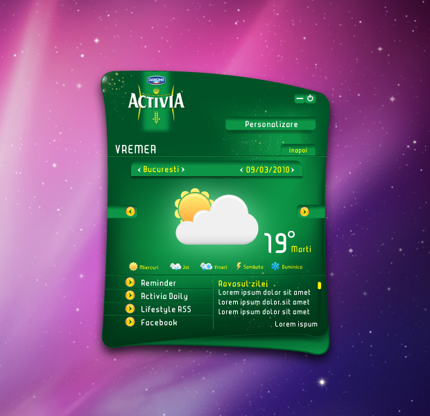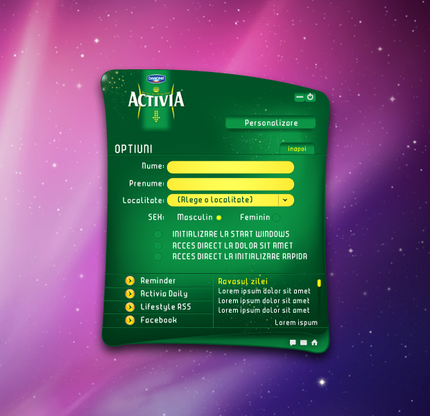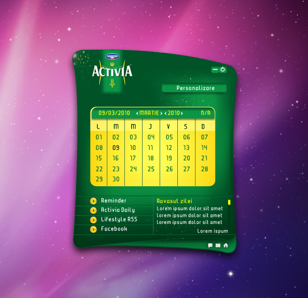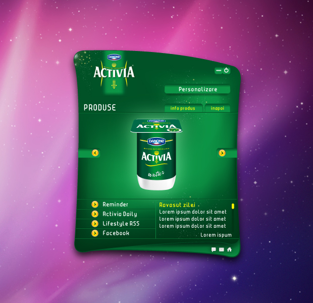 We were asked to develop the Activia Widget in order to be available as a desktop application. Because of the rich set of features that the widget had to integrate, we used PHP for server side programming and Adobe Air for the actual desktop application.
