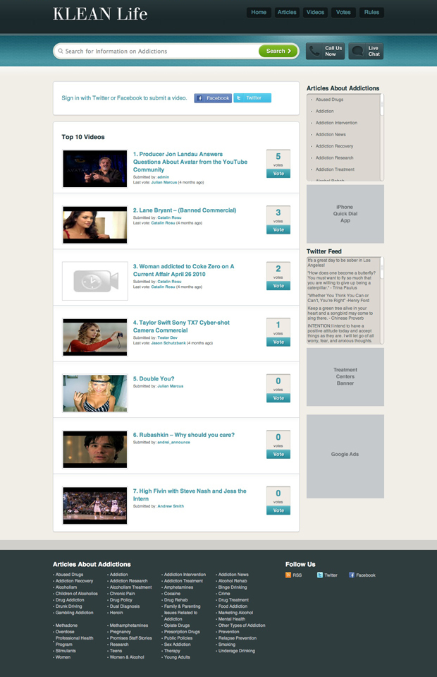 This project later evolved into a contest where people uploaded addiction related videos in order to win a week of free treatment offered by Klean Treatment Center.